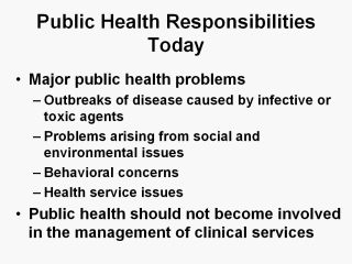 of concern: i) Outbreaks of disease caused by infective or toxic agents - for example smallpox, typhoid, food poisoning, BSE, radiation and so on; ii) Problems arising from social and environmental issues such as inadequate housing, unemployment, poverty, abortion, fluoridation of water; iii) Behavioral concerns such as smoking, excessive consumption of alcohol, drug-taking, absence of exercise; iv) Health service issues including assessment of health care needs and outcomes, and the effectiveness and efficiency of particular services. Given that these types of problem will continue to be faced in the future, how can the practice of public health be improved to address them directly and try to find solutions for the modern age? Public health, as a discipline, should not become involved in the management of clinical services whether in the community or within institutions - it lacks the expertise essential for this task. Its prime responsibility is to promote health and to prevent and control disease. It should thus have responsibility for surveillance and for the planning and co-ordination of measures which promote and maintain health. It should be involved in the planning and distribution of clinical services in accordance with measures of need and demand and the assessment of effectiveness. Since the major academic disciplines of public health, epidemiology, medical statistics and some aspects of the social sciences including economics, are the unique bases of training in public health, their contribution to the inter-disciplinary work required to develop clinical services in accordance with criteria of need, effectiveness and resource availability are required, and accepted, by the other disciplines involved. |