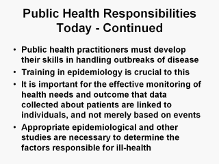 of disease surveillance, including notification are essential. Thus public health has key needs in the collection, analysis and dissemination of accurate information. It follows that it should have a major role in the design and establishment of appropriate information systems. It is important for the effective monitoring of health needs and outcome that data collected about patients are linked to individuals, and not merely based on events. Methods of record linkage which respect confidentiality pioneered in Oxford and Cumbernauld should become the norm, as they are in countries such as Sweden and Denmark. Although unique patient numbers were promised for introduction in the United Kingdom in 1996, they have yet to become a reality, apart from in Scotland where linked data in the form of CHI numbers is in routine use. Their information is central to more effective use of data systems in health care. Responsibility for the assessment of health and its maintenance implies the requirement to determine the factors responsible for ill-health. Public health must be involved in appropriate studies, whether epidemiological, sociological, psychological, or statistical, which enable hypotheses to be tested and solutions implemented for the control of ill health. Its major role is in the identification, and planning of appropriate methods of intervention, to correct deficiencies and prevent the occurrence of disease. This must be a multi-disciplinary activity. In purely medical terms however, roles can and should be distinguished. The role of public health in the surveillance, identification, planning and co-ordination of measures to prevent, if possible, the occurrence of disease, and to deal with it if it does occur, is central to the specialty. The implementation of appropriate preventive, curative and rehabilitative measures is the responsibility of clinicians, in both hospital and general practice. There is thus a clear distinction in the roles of public health and clinical medicine in this context. Public health identifies a problem and co-ordinates the service; general practitioners or hospital clinicians provide whatever treatment or management is appropriate. If these distinctions are recognized many of the factors causing friction will be removed or at least modified. The different knowledge and expertise of different medical specialties - and their inevitable overlap - must be acknowledged and respected if effective collaboration is to be achieved. |