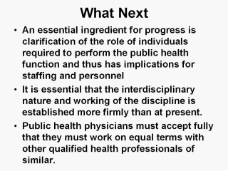 policies with hospital and general practice clinicians. If public health is to play the wider role envisaged, it is essential that the interdisciplinary nature and working of the discipline is established more firmly than at present. In the investigation of an outbreak of infectious disease for example, the consultant in communicable disease control has to work with microbiologists and with environmental health officers trained in environmental investigation and control. To devise appropriate programs of health promotion for a school, public health workers must be trained in education, psychology and sociology. Medical statisticians are important for design of investigations and the successful analysis and interpretation of data. Only if public health physicians accept fully that they must work on equal terms with other qualified health professionals of similar status will it be possible to achieve the crucial development and application of policies that can improve the population’s health. The proposals also have implications for the often uneasy interface between service and academic public health. Part of this is a result of the different emphasis of these two branches of the specialty. Academics can seem indifferent about the practical application of findings and some appear to consider that some service preoccupations are mundane in comparison with the development of knowledge. Similarly, the service side has sometimes seemed preoccupied with day-to-day problems and unwilling to invest in research efforts without an immediate pay-off. |
