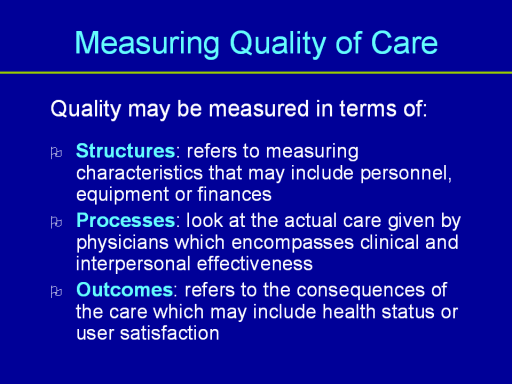 Quality of care is often measured using patient surveys (about both the process of care and the satisfaction with it), medical record audits, direct observation, or in combination with administrative data. However, these approaches tend to be costly and may be limited by data quality or confidentiality issues. Administrative claims data provide an alternative cost-effective source of information for health services research.