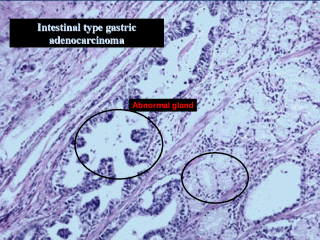 | Abnormal gland on left has large, round, nuclei at apical surface. The normal gland on the right has smaller nuclei at base of luminal cells. |