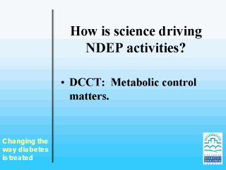 | Talking Points: Since 1997, when the program started, our messages and activities have been driven by the results of the DCCT. We have focused on promoting blood glucose control to people with diabetes, their social supporters, health care providers, and health care system decision makers. |