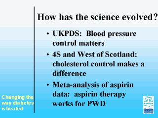| Talking Points: Over the past 4 years, major research studies have shown us that we need to go beyond glucose control. UKPDS made it clear that blood pressure control can have a major role in reducing morbidity and mortality. The 4S and West of Scotland studies showed that controlling cholesterol levels in people who don't have diabetes and in people who have it improves outcomes. The same thing was found in reviewing the research on aspirin therapy. |