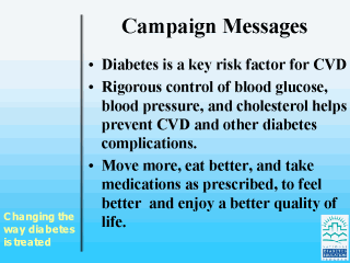 | Talking Points: What are the key messages the campaign will promote? We plan to emphasize that diabetes is a key risk factor for CV disease and that rigorous control of all three risk factors can help prevent heart disease and other diabetes complications. We also want to promote the fact that lifestyle behaviors such as moving more and eating better as well as taking medications can make a big difference in the way people feel. |