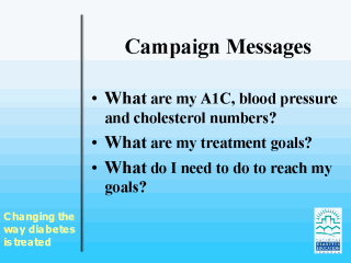 | Talking Points: Like the National Cholesterol and High Blood Pressure Education Programs, we want people with diabetes to ask their health care providers three key questions: What are my A1C, blood pressure and cholesterol numbers? What are my treatment goals? And What do I need to do to reach my goals? |