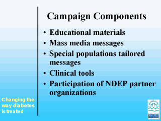 | Talking Points: At this time, the campaign will include educational materials such as brochures and checklists on diabetes and CVD control for people with diabetes. Yesterday, we kicked off the campaign with the ADA at a media briefing. We 'll continue to work with the media to place articles about this important health issue in magazines, newspapers, and on TV and radio news shows. We plan to work with our minority working groups to develop tailored PSAs for each of the special population groups.Our health care provider work group, which includes representatives from the AAFP, the ACP, the ADA, AADE, and the ADietA, is working with us to develop clinical practice tools to improve the quality of comprehensive diabetes care. And, we will involve the program's 200 partner organizations in disseminating the campaign messages to their constituents. |