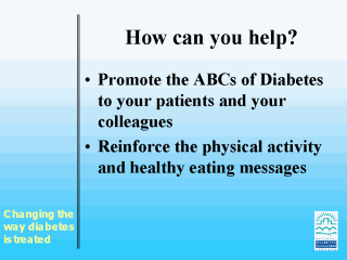 | Talking Points:We need your help as well. We hope you'll keep promoting the ABCs of Diabetes Control to your patients and help them make the lifestyle changes they need to make to control all three risk factors. And by all means, spread the word about the campaign and its resources to your colleagues. (End of Dr. Fradkin) |
