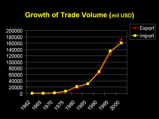 | 1962 export: 54 mil us$, import 390mil us$. 2000 export: 172 bil and,268 mil USD import: 160 bil and, 481 us$. |