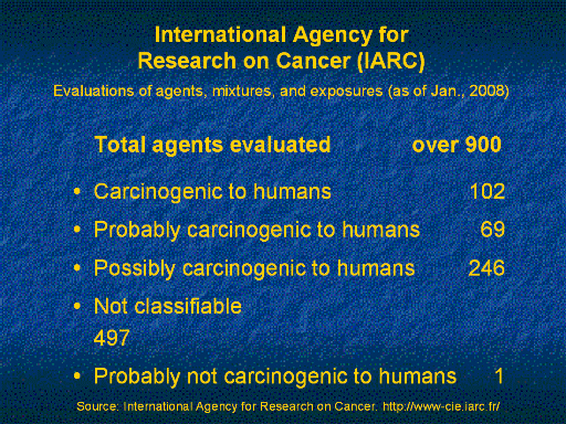 Cancer. http://www-cie.iarc.fr/ Of the 900 agents evaluated, IARC has categorized: 95 as Group 1, Carcinogenic to humans 66 as Group 2A: Probably carcinogenic to humans 241 as Group 2B: Possibly carcinogenic to humans 497 as Group 3: Not classifiable 1 as Group 4: Probably not carcinogenic to humans. Only one! --So, about 400 of the 900 suspected agents that were evaluated, were found to be carcinogenic or probably or possibly carcinogenic to humans. --These are not good odds. --Given the high standards assigned to these kinds of evaluations – and given that there are about 100,000 synthetic chemicals in use today – we have a lot to worry about. Wouldn’t it be easier to cure cancer? |