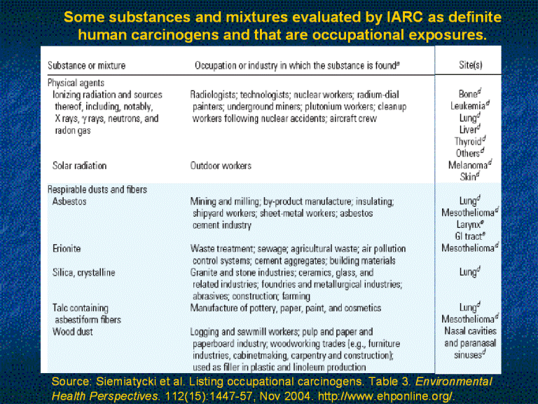 Source: Siemiatycki et al. Listing occupational carcinogens. Table 3. Environmental Health Perspectives. 112(15):1447-57, Nov 2004. http://www.ehponline.org/.