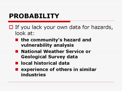 sources you should also consider: For businesses the community’s hazards and vulnerability analysis. For individual jurisdictions, it is probably useful to consult the analyses done by neighboring jurisdictions and the next higher level of government. Specialist data available from meteorological and geological organizations. Local historical data from historical societies, published local histories, and newspaper archives. The experience of others in your same situation – other businesses in the same or similar industries, other schools, other emergency management agencies. |