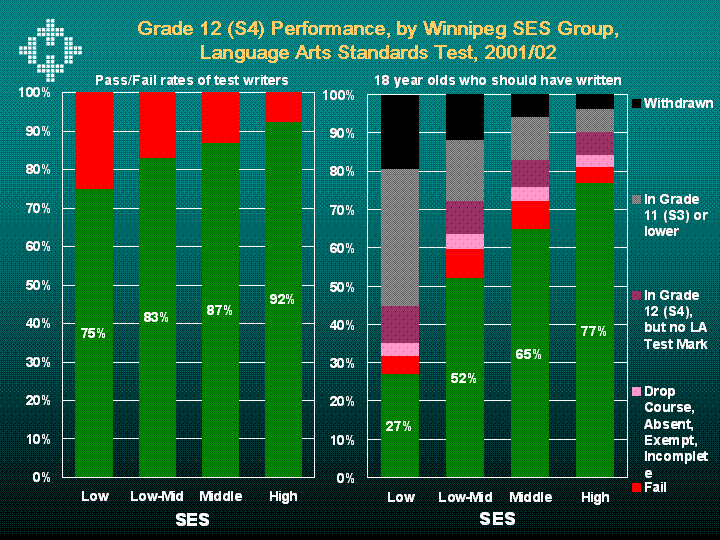 The graph on the right captures a different reality: only 27% of the youths in the Low SES areas who should have been writing the standards test that year passed. A very large group (almost 36%) were behind at least one year (in grade 11 (S3) or lower), and almost 20% had withdrawn (not enrolled in school for at least 2 years). For all 4 SES groups, if students were in grade 12 and writing – the great majority passed, but many of the kids from Low SES areas had not yet made it to grade 12 (and many were not in school at all). |