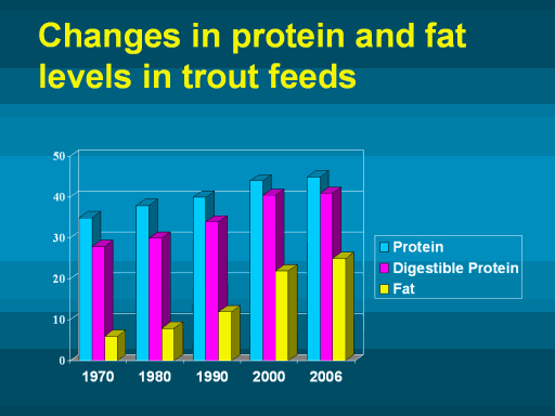 decades, the amount of protein in trout feeds has increased from 36% to