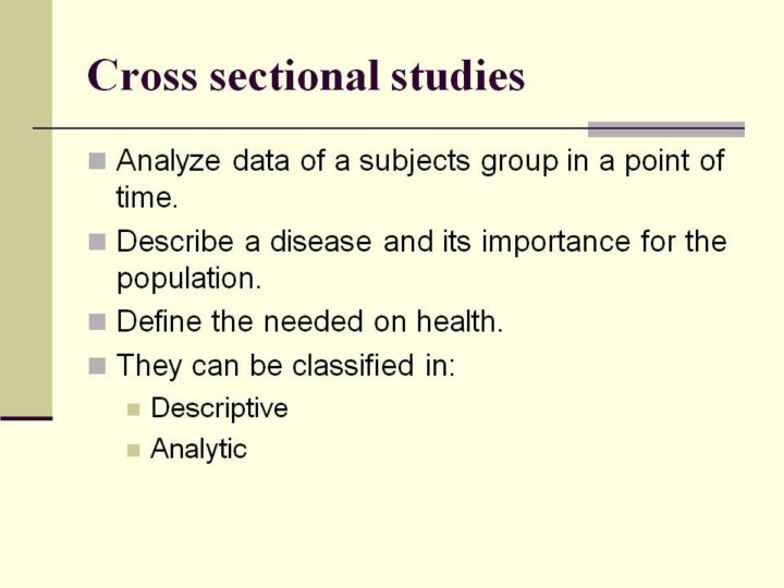 They are called prevalence studies. They help us to know the economic, social burden of a disease in a population in a point of time. They can be: descriptive or analytic. The descriptive only show the frequency of exposure and of outcome in population in a point of time; in analytic studies we search to show the exposure and outcome in a point of time, searching associations with Prevalence Ratio or Odds Ratio. |