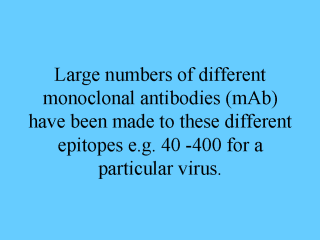 strong antibody responses. Antibodies to epitopes on the outside of the virus often neutralise in-vitro and protect in-vivo because they prevent attachment. Antibodies to epitopes on the inside of the virus do not neutralise. They are widely used to identify a particular virus in tissues e.g. rabies inclusions in a dog brain or FeLV in cat blood. T cells bind to peptide derived from the manufacture of the surface or internal proteins of the virus. The peptides which are produced in highest quantity and also fit into the MHC grooves are the usual targets. |