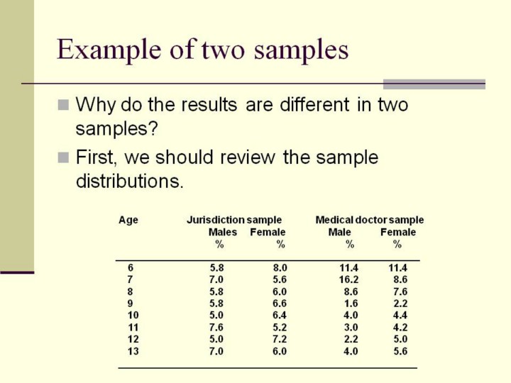 The jurisdiction epidemiologist had a randomized sample from all children registered in elementary schools in the jurisdiction, because of this the age and gender distribution is more homogeneous that in sample obtained by the medical doctor, because, this sample was not randomized. Conclusion. This fact is demonstrating the importance of randomized samples. Although the number of subjects in each sample is the same (500), the results are different, because the sample of medical doctor has more children with less age (almost 45% had between 6 and 7 years) and they are not representative from all population f children registered in the schools. |
