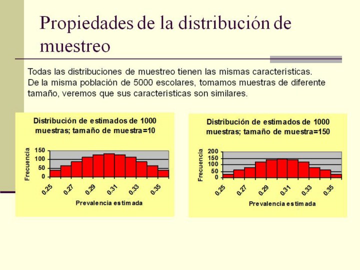 Entre las gráficas ¿nota algo, en cuanto a la media, sus rangos de valores y sus formas? Las medias de las tres distribuciones es 30%, ya que es el verdadero valor de la población. Los rangos de los valores varían un poco, encontrando más extremos valores cuando el tamaño de la muestra es más pequeño. Entre más grande el tamaño de muestra, más parecida la distribución de muestreo con la distribución Normal. |