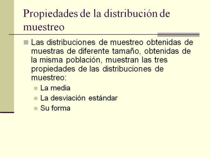MEDIA La media de un gran número de estimaciones obtenidas de muestras de tamaño idéntico es igual al valor de la población. Aunque las estimaciones obtenidas de muestras individuales varían, su media conjunta será siempre igual al valor de la población. DESVIACION ESTANDAR La desviación estándar de una distribución de muestreo, disminuirá si el tamaño de muestra se incrementa. La desviación estándar de una distribución de muestreo toma el nombre de error estándar, ES. Recuerde que la desviación estándar representa la variabilidad en los datos individuales. El error estándar representa la variabilidad en las estimaciones de las muestras. El error estándar depende directamente de la raíz cuadrada del tamaño de muestra utilizado.