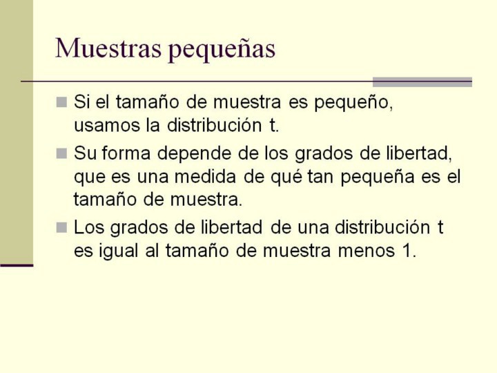 Hemos calculado los intervalos de confianza y la realizado la prueba de hipótesis, para sacar provecho de las propiedades de las distribuciones de muestreo. La más importante de esas propiedades dice que todas las distribuciones de muestreo son Normales si el tamaño de muestra es suficientemente grande. Cuando el tamaño de muestra es pequeño, la distribución de las medias de las muestras no es exactamente Normal, aunque sea similar a la Normal. Esta es la distribución t. La forma de esta distribución depende sus grados de libertad, que es una medida de cuan pequeña es el tamaño de muestra.