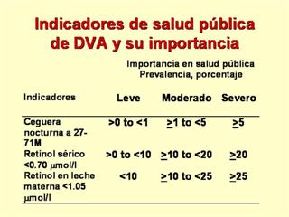 niveles: ceguera nocturna en 5% o más de niños, bajo retinol sérico en