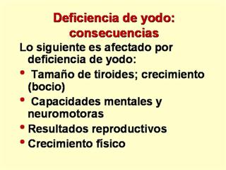 Respuesta a la DI es el crecimiento de la glándula tiroides. Bocio puede aparecer en la preadolescencia, y las tasas pueden alcanzar el 100% de deficiencia de yodo cuando es grave. Nódulos tiroideos aparecen cuando la DI es severa. Mientras que el bocio es menos peligros por sí mismo, los nódulos pueden causar obstrucción de la tráquea o menoscabar la función de los nervios laríngeos. Cierto aumento en las tasas de cáncer es sospechoso de estar asociado con casos de bocio. |