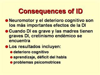En deficiencia de yodo menos severa, efectos neurológicos van desde cambios neurológicos detectables hasta afectación de la capacidad de aprendizaje y rendimiento escolar, o disminución de la capacidad para manejar las pruebas formales de las funciones psicomotoras.