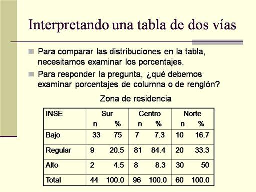Si la distribución de INSE fuera la misma en cada sitio de residencia, los porcentajes de columnas serían los mismos para cada sitio de residencia. Parece que los porcentajes de iNSE bajo difieren entre los sitios de residencia; sin embargo, los datos están sujetos a errores de muestreo, por lo que necesitamos evaluar si esas diferencias en las proporciones de la muestra reflejan diferencias en las poblaciones. Para hacer esto, necesitamos una prueba de hipótesis. |