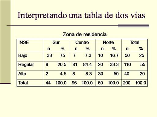 Igualmente, debemos esperar que 25% de los habitantes de la región Sur tengan nivel INSE bajo. 25% de 44 = 11 y se debe realizar lo mismo para cada celda de la tabla. |