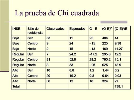 Conociendo el valor de X2 y los grados de libertad, podemos obtener la probabilidad de obtener los valores observados o más extremos si la hipótesis nula fuera verdad (valor de p). Vemos las tablas de la distribución de X2 y en el renglón de 6 grados de libertad buscamos el valor que obtuvimos (138.1) en las columnas a 4 grados de libertad y el valor correspondiente a 0.0001, todavía es pequeño a relación a 138.1 |