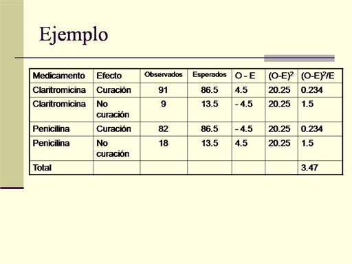 La prueba de X2=3.47 ¿Cuántos grados de libertad corresponde a esta tabla? Grados de libertad = (número de columnas –1) x (número de renglones – 1) =1. Para una tabla 2 x 2 los grados de libertad siempre serán 1. Refiriéndonos al las tablas de la distribución de X2 y grados de libertad 1, el valor de p es 0.1<3.47>0.05. ¿Acepta o rechaza la hipótesis nula? El resultado es limítrofe. Necesitamos los intervalos de confianza para determinar si rechazamos o aceptamos la hipótesis nula. |