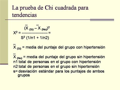 Para el ejemplo, que hemos revisado X2= (2.1 – 1.99)2 /0.0672 (1/150 + 1/310) = 275 con 1 grado de libertad p<0.05 Con este resultado, rechazamos la hipótesis nula y decimos que hay fuerte evidencia de que existe una tendencia. |