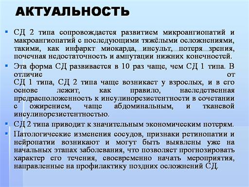Показана возможность предотвращения перехода нарушения толерантности к глюкозе в СД при адекватном проведении профилактических мероприятий, а также замедления развития осложнений СД и улучшения прогноза при своевременном его лечении. |