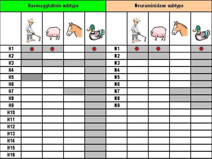 | Influenza A viruses are found in many different animals, including ducks, chickens, pigs, whales, horses, and seals. There are 16 different haemaglutinin subtypes and 9 different neuraminidase subtypes, all of which have been found among influenza A viruses in wild birds. Wild birds are the primary natural reservoir for all subtypes of influenza A viruses and are thought to be the source of influenza A viruses in all other animals. Most influenza viruses cause asymptomatic or mild infection in birds; however, the range of symptoms in birds varies greatly depending on the strain of virus. Infection with certain avian influenza A viruses (for example, some strains of H5 and H7 viruses) can cause widespread disease and death among some species of wild and especially domestic birds such as chickens and turkeys. Pigs can be infected with both human and avian influenza viruses in addition to swine influenza viruses. Infected pigs get symptoms similar to humans, such as cough, fever, and runny nose. Because pigs are susceptible to avian, human and swine influenza viruses, they potentially may be infected with influenza viruses from different species (e.g., ducks and humans) at the same time. If this happens, it is possible for the genes of these viruses to mix and create a new virus.