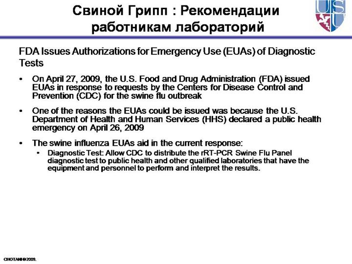 | FDA authorizes emergency use of influenza medicines, diagnostic test in response to swine flu outbreak in humans [news release]. Rockville, MD: U.S. Food and Drug Administration. April 27, 2009. http://www.fda.gov/bbs/topics/NEWS/2009/NEW02002.html. Accessed April 28, 2009.