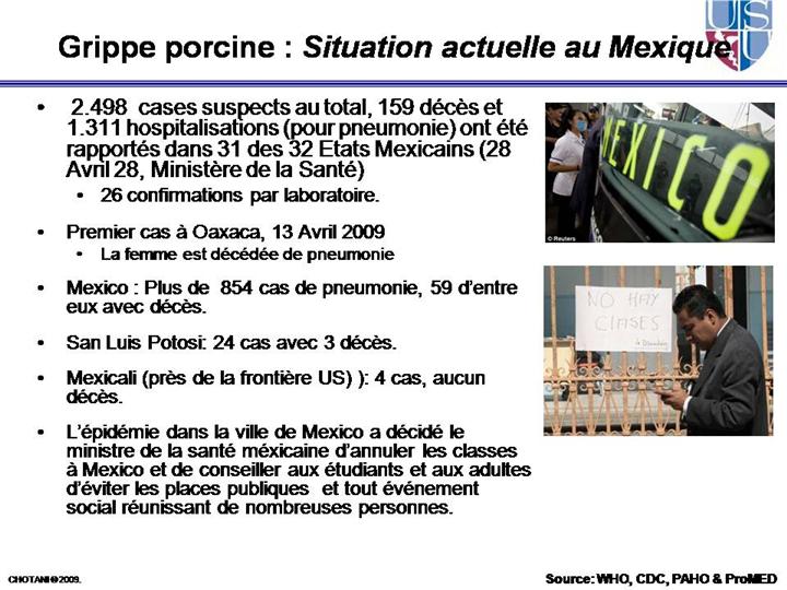 Au Mexique, les mesures de prévention et de contrôle sont coordonnées, y compris des l’intensification des activités de surveillance. Comme mesure de précaution, la fermeture des centres de soins de jour, des écoles et des universités a été décidé dans la ville de mexico. En même temps, les activités culturelles et sociales ont été suspendues pour une période de 10 jours.