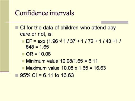 OR Odds Ratio EF Error factor The interpretation is that the I have 95% of confidence that the Odds Ratio in the population is between 6.11 and 16.63. |