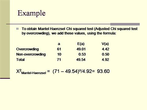 So, after adjusted by overcrowding, Chi squared is reduce from 111.88 to 93.6. The p-value that correspond to this Chi squared value is P < 0.0001. The association between attend to nursey and respiratory infection is highly significative, after adjueste by confounder variable (overcrowding). |