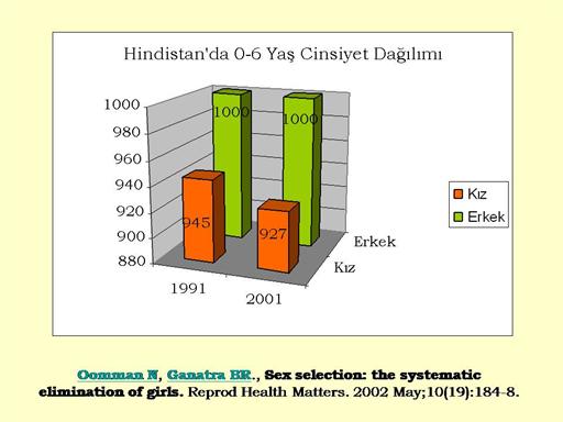 Oomman ve Ganatra’nın 2002 yılında yayınladıkları bir derlemede, 1980’lerle beraber ultrasonun kullanılmaya başlaması ile Hindistan’da sorunun çok önemli bir boyuta geldiği belirtilmektedir. 2001 yılındaki genel nüfus sayını sonuçları on yıllık dönemdeki değişimi gözler önüne sermiştir. 0-6 yaş cinsiyet dağılımı 1991 yılında her 1000 erkek için 945 kız iken, 2001 yılında 927’dir. |