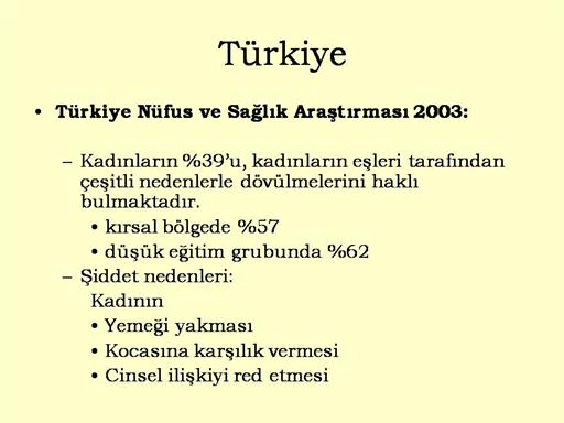 Aradan geçen on yıl verilerin değişmediğini ortaya koymaktadır. Hacettepe Üniversitesi Nüfus Etütleri Enstitüsü’nün "Türk Nüfus ve Sağlık Araştırma (TNSA)-2003" sonuçlarına göre, kadınların %39’u, kadınların eşleri tarafından çeşitli nedenlerle dövülmelerini haklı bulmaktadır. Bu oran kırsal bölgede %57 ve düşük eğitim grubunda %62’ye kadar çıkmaktadır. Şiddet nedenleri arasında, kadının yemeği yakması, kocasına karşılık vermesi, cinsel ilişkiyi red etmesi gibi nedenler bulunmaktadır. Bir çok çalışmada şiddete uğrayanlar, eşin şiddet kullanmasından kendini sorumlu gördüklerini belirtmişlerdir. Şiddete maruz kalan kadınların buna bakışı da toplumsal rollerinde ona öğretilenden başka olamamaktadır. İran’da, çoğunluğu etnik Arap olan Kuzistan bölgesinde, 2003 yılında iki aylık bir süre içinde 20 yaşından küçük 45 kadın, yakın akrabaları tarafından “namus” cinayetine kurban gitmiştir (Middle East Times, 31 Ekim 2003).