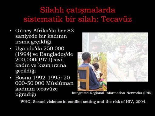 Toplumsal cinsiyete dayalı şiddetin vardığı son nokta silahlı çatışmalarda tecavüzün bir silah olarak sistematik kullanımıdır. Güney Afrika’da her 83 saniyede bir kadının ırzına geçildiği, Uganda’da 250 000 (1994) ve Bangladeş’de 200,000(1971) sivil kadın ve kızın ırzına geçildiği bilinmektedir. Bosna 1992-1995: 20000-50 000 Müslüman kadının tecavüze uğramıştır ve bu rakam müslüman kadın populasyonunun %1.2sidir. Şiddet, kadınların üreme sağlığını da etkilemektedir. CYBH ve HIV/AIDS açısından riski arttırmaktadır. Uganda’da 1994’te % 1 olan HIV prevalansı 1997’de %11e yükselmiştir. Bir çalışmada %17 HIV bulaşı bildirilmiştir. Şiddete dayalı cinsel ilişki kadınların genital sistemlerinde kronik pelvik ağrı, ağrılı ilişki yakınmaları ya da istenmeyen gebelikler ile sonuçlanabilir. Bu durum, kadınlarda intihara varan ruhsal sorunlarla sonuçlanabilir. Bu sorunların sağlık sistemlerine yükü de artmaktadır. Amerika Birleşik Devletlerinde yapılan çalışmalarda tecavüze uğramış kadınların tedavi maliyetlerinin de aynı yıl içinde mağdur olmayanlara göre 2.5 kat fazla olduğu saptanmıştır. Şiddet mağduru kadınlar çoğu zaman, ancak gelişmiş olan ülkelerde sağlık sistemlerine başvurup, hizmet alabilirken, gelişmekte olan ülkelerin çoğunda ya hiç başvurmamakta, ya da yetersiz hizmet nedeniyle, yaşam boyu sürecek fiziksel ve psikolojik sağlık sorunlarını ile baş etmek zorunda kalmaktadırlar. |