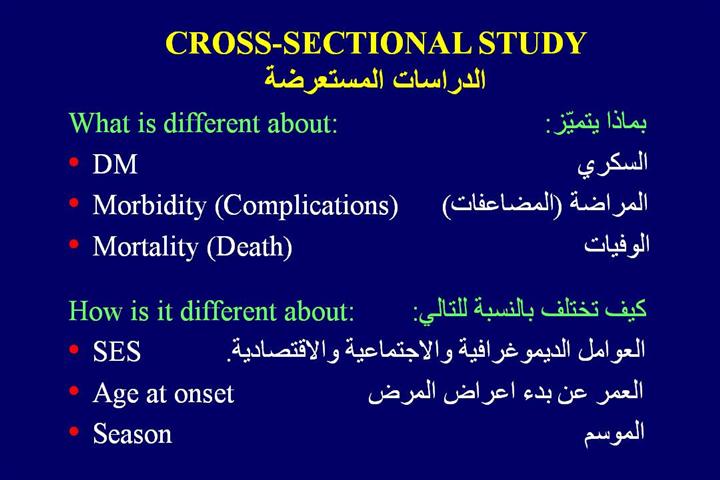 Cross-sectional studies have been used in describing general and clinical characteristics of different type of diabetes such as Insulin Dependent Diabetes Mellitus, Non Insulin Dependent Diabetes Mellitus and Gestational Diabetes. This method of study has been widely used in describing a patients clinical, demographic, and family history, as well as exercise, diet, habits, life style, and the glucose metabolism of subjects morbidities and mortalities with and without diabetes. It helps to understand the potential risk factors such as socio-economic status, age at onset, seasonal characteristics as well as the pattern of disease. الدراسات المستعرضة تم استخدامها في وصف الخصائص العامة و السريرية لمختلف أنواع السكري من النوع الأول المعتمد على الأنسولين أو النوع الثاني الغير معمد على الأنسولين أو سكر الحمل. هذه الطريقة استعملت بشكل واسع في وصف خصائص مرضى السكري الديمغرافية و السريرية و تاريخ العائلة المرضي ، بالإضافة إلى عادات المريض من ممارسة الرياضة و الأكل و أسلوب الحياة ,و هضم السكر و مقارنتها مع المراضة والوفيات من الأشخاص الغير مشخصين بالسكري. أن هذه الدراسات تساعد في فهم عوامل الخطورة الممكنة مثل الحالة الاجتماعية والاقتصادية والعمر عند بدء المرض و الخصائص الموسمية بالإضافة إلى نسق المرض. |