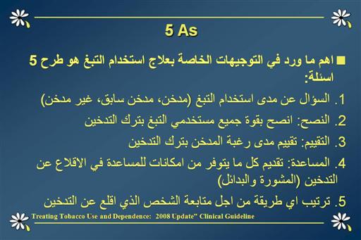 5 As A1. Ask—Systematically identify all tobacco users at every visit A2. Advise—Strongly urge all tobacco users to quit A3. Assess—Determine willingness to make a quit attempt A4. Assist—Aid the patient in quitting (provide counseling and medication) A5. Arrange—Ensure follow-up |