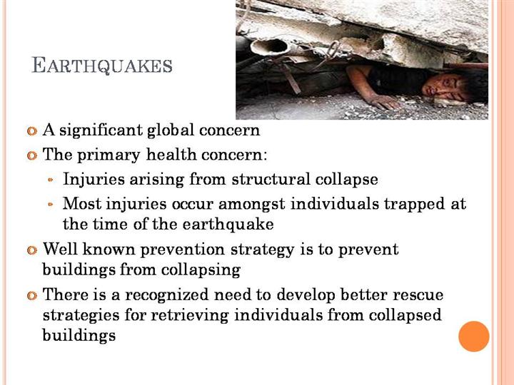 Head and chest injuries and fractures are common in earthquake victims. Nurses poses clinical skills that can save lives when they assist in searching and retrieving trapped individuals. Also the injury rate is high for first responders, and nurses can play a major role in protecting the rescue teams. In fact all rescue teams should have at least one nurse. |