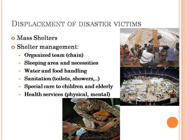 Immediate response is mostly concerned with saving lives and eliminating immediate threats. However, what is substantial too is working with survivors with minimal or no physical injuries. These groups are usually displaced in shelters to meet their survival needs. Survivors vary according to age groups or health conditions. These shelters are expected to work in a systematic way to ensure high performance. Lay professional volunteers can assume the role of organizing and management of the shelter. Nurses can be spared for other important tasks such as taking care of the affected people, assessing their health conditions and any special needs and use the available resources to attend to these health needs. Nurses can be responsible for establishing mental services, counseling and providing social support especially that under such circumstances people need to make meaning of what happened and how to adjust in order to be able to continue their lives. Pediatric nurses have the most burden because children unlike other populations need to have an outlet for their energy, have their own ways of understanding and coping to unusual conditions.