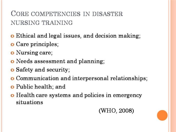 To build national and international capacity of nurses, the WHO proposed a set of competencies that are essential in disaster preparedness training program. |