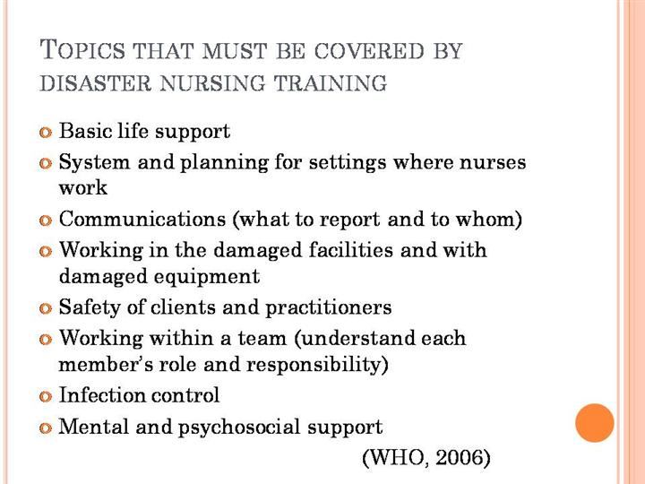 World Health Organization (2006). The contribution of nursing and midwifery in emergencies. Geneva, Switzerland |
