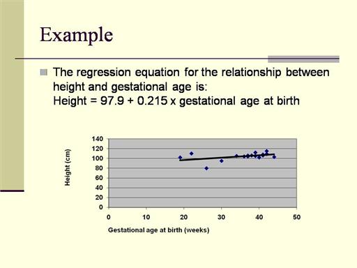 The graph shows the relationship between height and gestational age at birth of 21 children of 5 years of age. The goal is to see if the gestational age at birth is associated with growth affected. The response variable is high and the explanatory variable is age. |