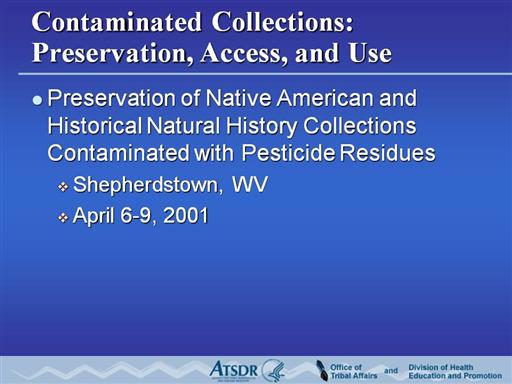 In April 2001, several American Indian and non-Indian preservation professionals, scientists, public health officials, and attorneys participated in a symposium at the National Conservation Training Center in Shepherdstown, West Virginia. The purpose of the symposium was to jointly address various issues related to the use and repatriation of museum objects that may be contaminated with pesticides. Today I will discuss a few of the relevant public health issues associated with this topic. |
