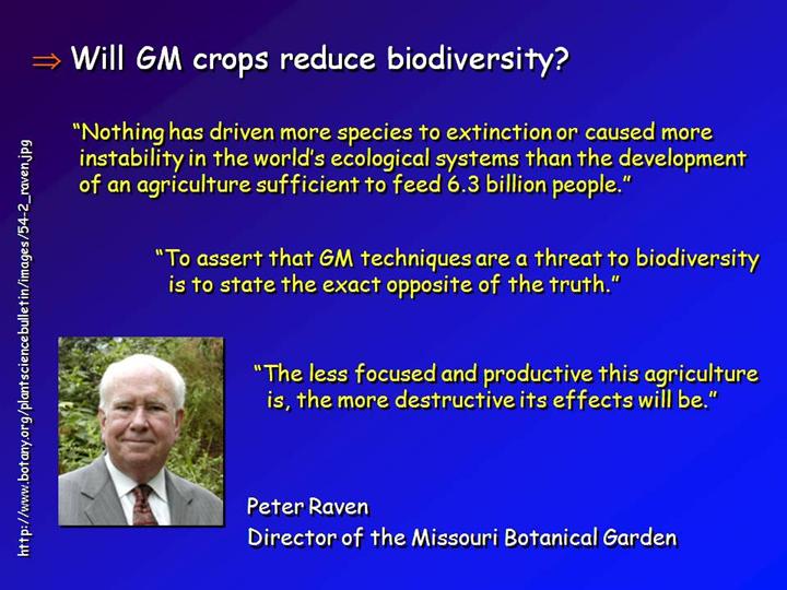 On the larger issue of biodiversity, the kind of biological diversity that is preserved in wild ecosystems of all kinds, I quote the words of Peter Raven, director of the Missouri Botanical Garden and tireless champion of biodiversity. He says: “Nothing has driven more species to extinction or caused more instability in the world’s ecosystems than the development of an agriculture sufficient to feed 6.3 billion people.” It is important to know what this means for biodiversity in the future. The world’s human population is expected to grow to somewhere in the neighborhood of 9 billion people in the coming decades. But, the amount of farmland hasn’t changed in 50 years because we are losing good cropland to desertification, salinization, and urbanization as fast as we are adding it by chopping down species-rich tropical forests. The choice comes down to biodiversity or food, unless we can grow more on less land. Raven further says: “To assert that GM techniques are a threat to biodiversity is to state the exact opposite of the truth. The less focused and productive this agriculture is, the more destructive its effects will be.” What means is that if we want to preserve biodiversity, we have to grow more food, quite a lot more, on the land we already cultivate. http://www.botany.org/plantsciencebulletin/images/54-2_raven.jpg |