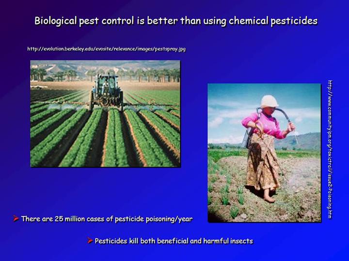 Both people and wildlife benefit from insect-resistant crops. Pesticides are applied quite safely using climate-controlled tractors in the highly mechanized agriculture of developed nations, but there are some 25 million cases of pesticide poisoning every year in less developed countries where farmers often have little protection, applying it from backpacks. Moreover, pesticides kill a broad spectrum of insects, both harmful and beneficial. In just 12 years between their their initial introduction in 1996 and 2008, insect resistant GM cotton and corn have reduced the amount of pesticide used by almost 290,000 metric tons of active ingredient. That means more insects and more wildlife, such as birds, which can thrive along with crops. In China, farmers growing GM rice reduced their pesticide use by nearly 80 per cent and more than half of them used no pesticide at all. More than 10% of farmers growing conventional rice showed symptoms of pesticide poisoning, while none of the farmers growing Bt-resistant rice did. http://evolution.berkeley.edu/evosite/relevance/